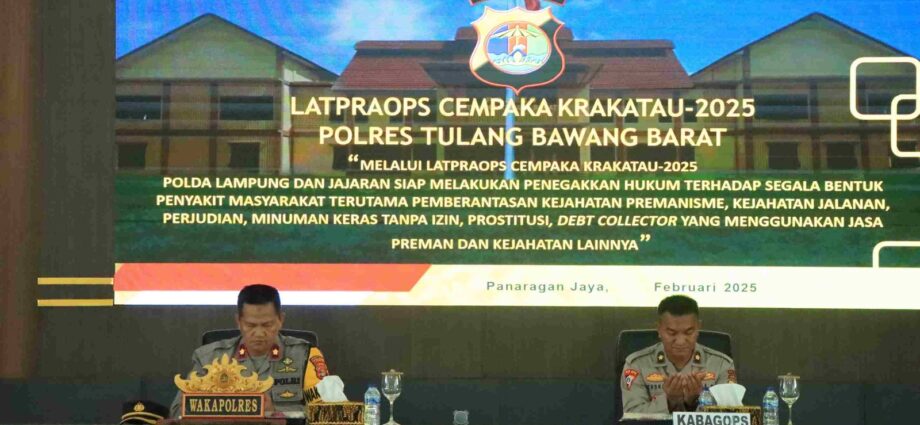 Tulang Bawang Barat, M-TJEK NEWS – Menjelang pelaksanaan Operasi Cempaka Krakatau 2025, Polres Tulang Bawang Barat menggelar Latihan Pra Operasi (Latpra Ops) di Aula Sarja Arya Racana, Mapolres Tubaba, Jumat (28/2/2025) pagi.